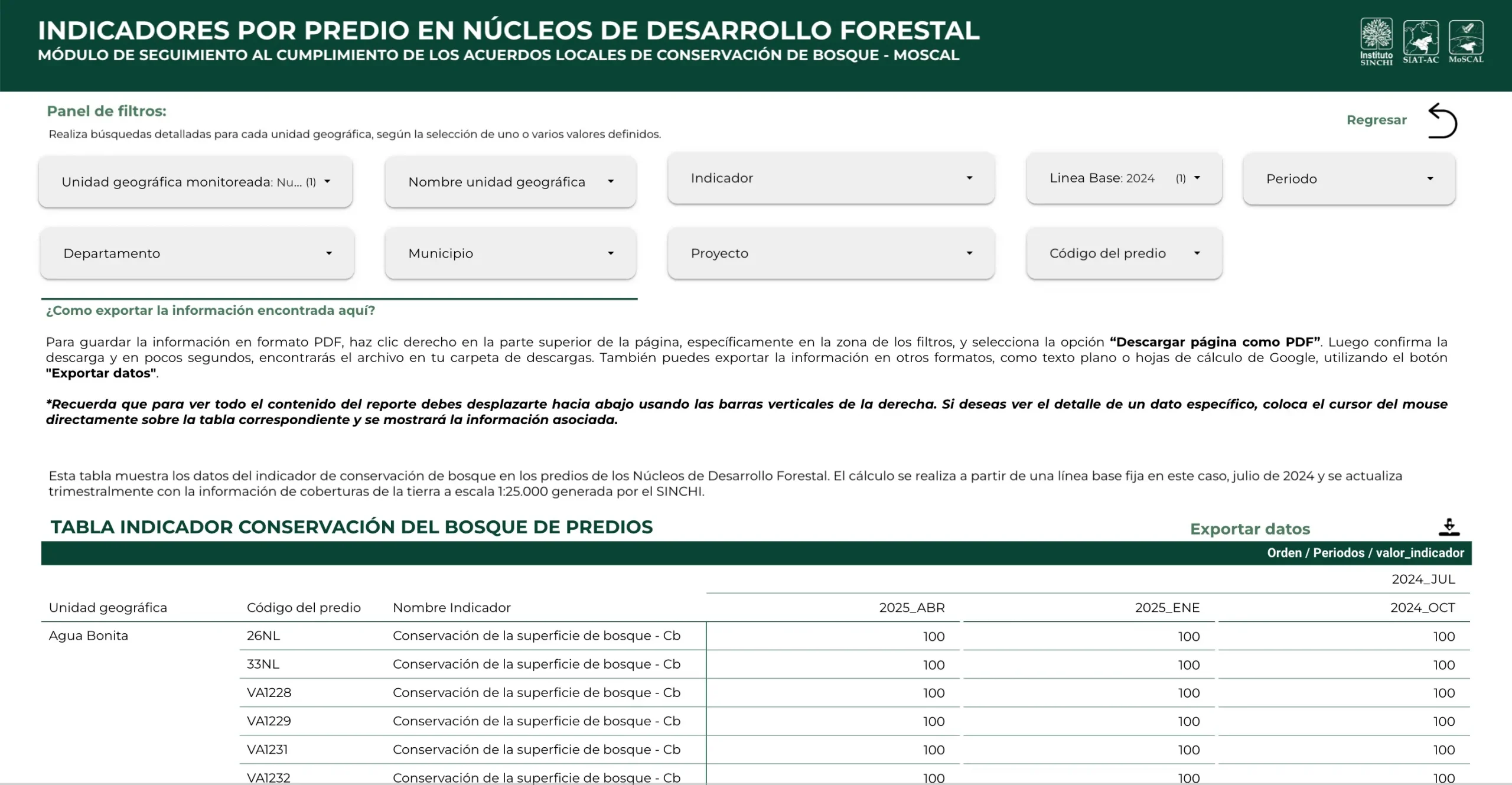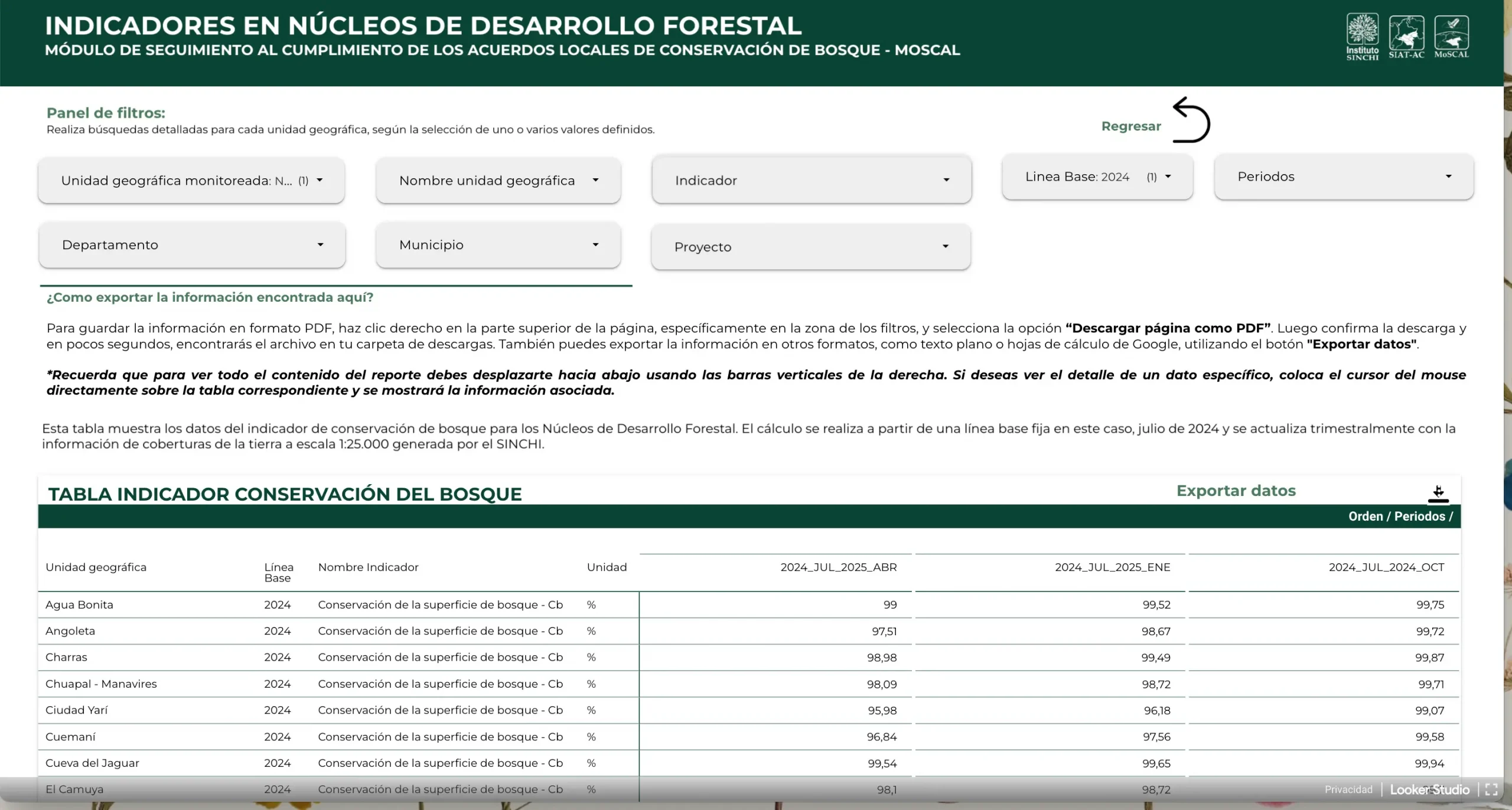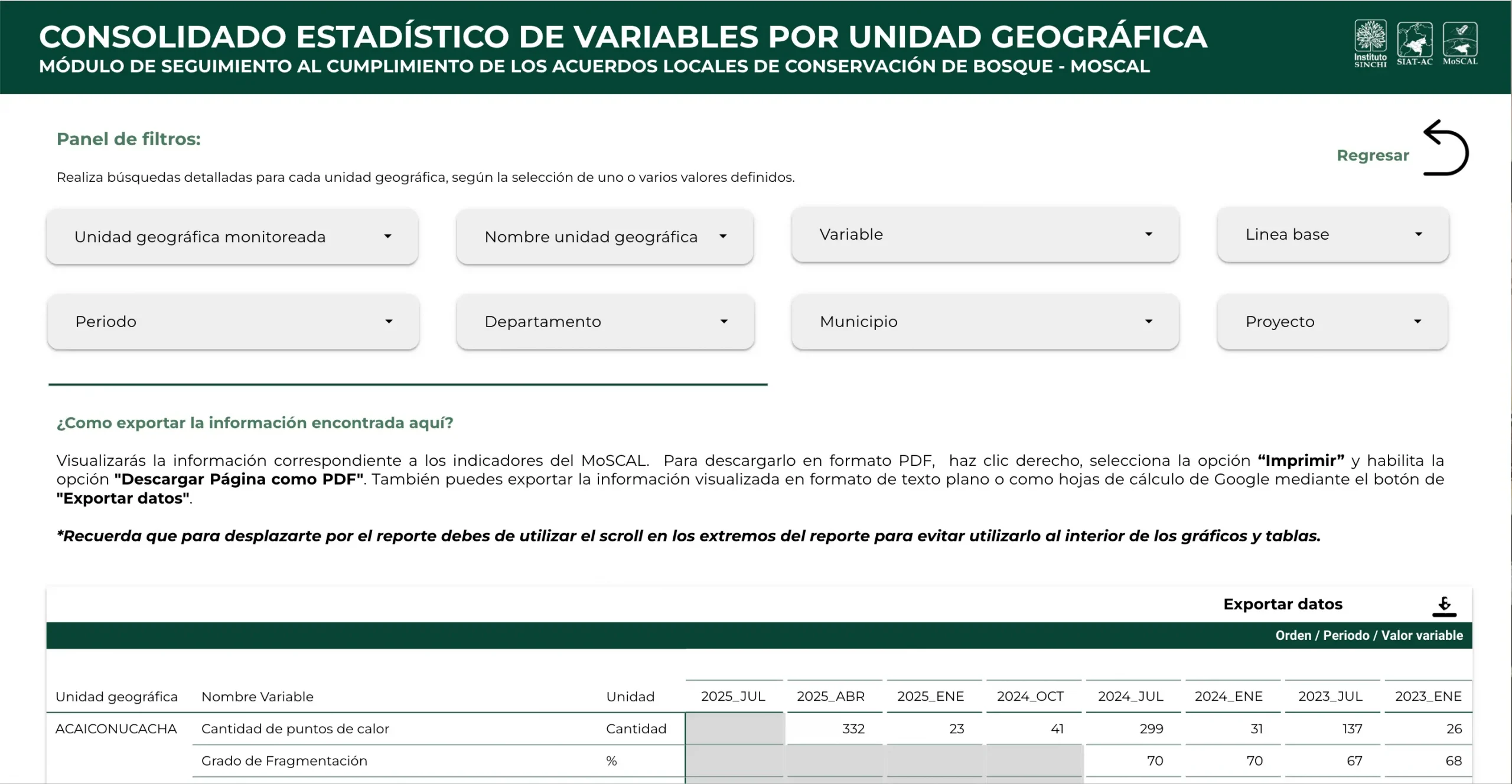 Seleccione entre los datos estadísticos: consolidado de indicadores de seguimiento, indicador de conservación del bosque o variables de seguimiento a los acuerdos de conservación de bosque .