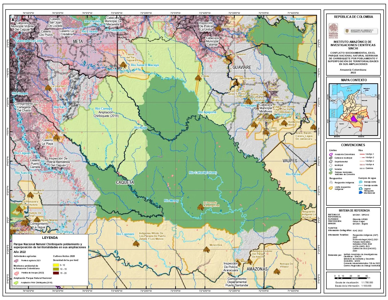El Parque Nacional Natural Serranía de Chiribiquete fue reservado, alinderado y declarado mediante Acuerdo No. 0045 del 21 de septiembre de 1989, de la Junta Directiva del Instituto Nacional de los Recursos Naturales Renovables y del Ambiente -INDERENA-, con un área aproximada de 1’298.955 Ha, en los departamentos del Guaviare y Caquetá, y aprobado mediante Resolución Ejecutiva No. 120 del 21 de septiembre de 1989, expedida por el Ministerio de Agricultura (PNNC, 2022). En el año 2013, mediante Resolución No. 1038 del 21 de agosto de 2013, expedida por el Ministerio de Ambiente y Desarrollo Sostenible, se amplió hacia los municipios de Cartagena del Chairá, San Vicente del Caguán y Solano en Caquetá, y Calamar en el Guaviare, en una extensión aproximada de 1’483.399 Ha, para un total aproximado de 2’782.354 Ha. Recientemente, se efectuó una nueva ampliación en los municipio de San José del Guaviare, Miraflores y Calamar en el Guaviare; y en San Vicente del Caguán y Solano en el departamento del Caquetá, acto formalizado mediante la resolución 1256 del 10 de julio de 2018, del Ministerio de ambiente y desarrollo sostenible-MADS (PNNC, 2022).