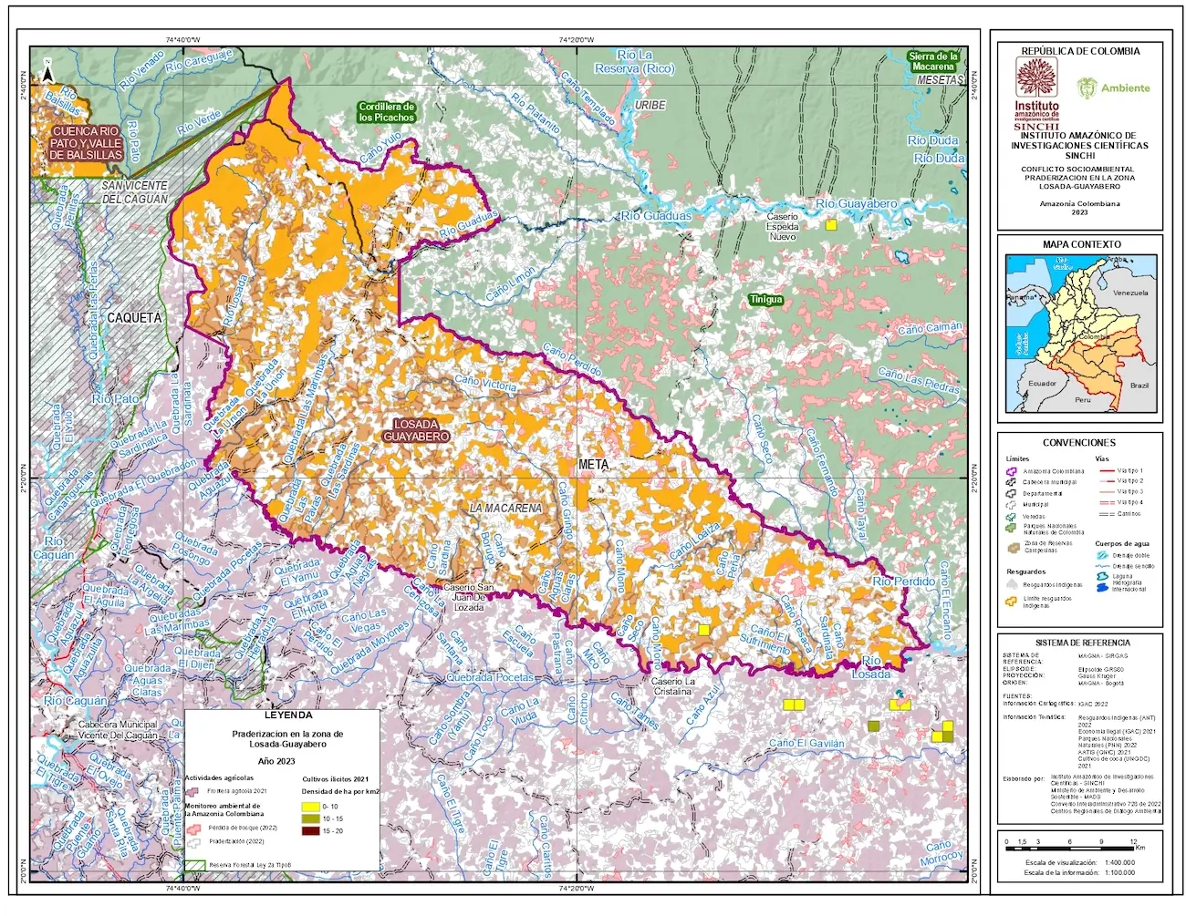 SIAT-AC Instituto Amazónico de Investigaciones Científicas SINCHI (2023). Atlas de conflictos socioambientales de la Amazonia colombiana. Praderización en la zona de Losada-Guayabero [Página web]. Disponible en: https://siatac.co/tipologia-agropecuarios-y-gestion-forestal/#022
