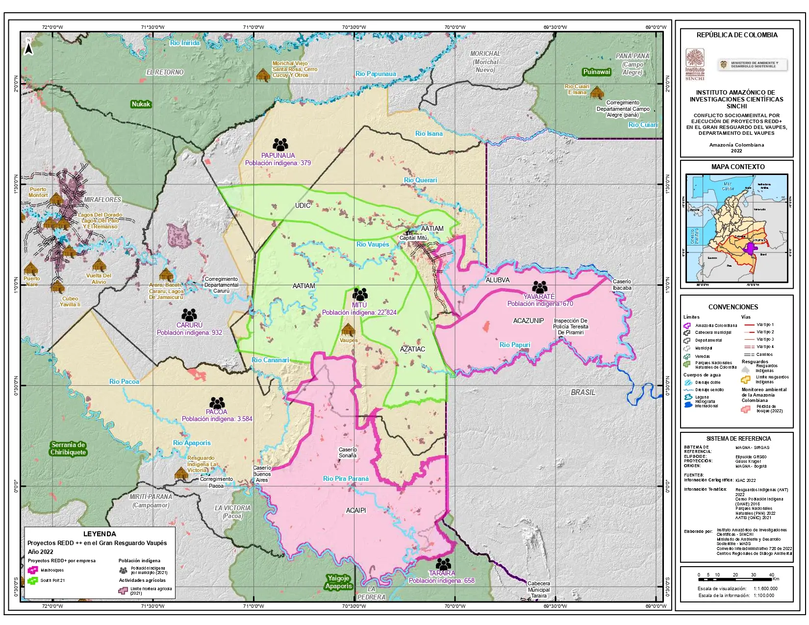 Desde inicios de la década de 2010 distintas empresas intermediarias han iniciado contactos para introducir tierras de resguardos indígenas de diferentes departamentos amazónicos a proyectos REDD+. A pesar de algunas campañas informativas sobre el funcionamiento de estos proyectos hechas desde el sector institucional y organizaciones no gubernamentales, la llegada de estas nuevas dinámicas ha generado dudas, desafíos y tensiones entre los distintos actores involucrados en su formulación y ejecución (Sinchi, 2023). Al ser un asunto relativamente nuevo, hay vacíos en la jurisdicción sobre los alcances de los proyectos y sobre su realización en un contexto de intereses variables de múltiples actores y de distintas figuras de ordenamiento territorial como resguardos y Parques Nacionales Naturales (El Espectador, 2023; Dejusticia, 2023), si bien se han venido estableciendo más regulaciones y rutas metodológicas para su realización, llamadas salvaguardas ambientales y sociales (Ministerio de Ambiente, 2020, 2023).