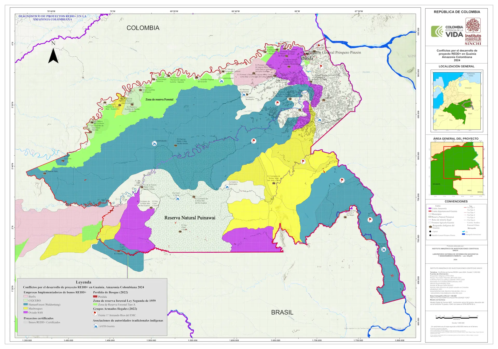 Dentro de las iniciativas REDD+ en la amazonia colombiana, Guainía ha sido un departamento en el que las empresas han encontrado una gran oportunidad para el desarrollo de este tipo de proyectos dada la conservación de los bosques. Esta confluencia de empresas que se ha estado dando en el departamento en las últimas dos décadas, ha generado una gran especulación financiera y monetización de los bosques que se encuentran en las zonas de resguardos, lo que en gran parte ha desencadenado una serie de tensiones territoriales que han intensificado los conflictos socioambientales (Díaz & Ruiz-Nieto, 2023).