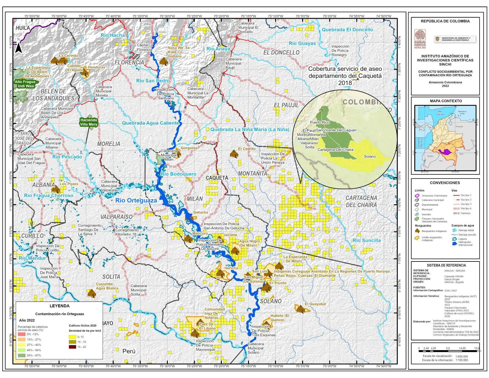Este conflicto socioambiental por contaminación hídrica, es tan solo un ejemplo de la delicada y grave situación de diferentes ríos en el departamento del Caquetá, debido a la falta de PTAR (Plantas de Tratamiento de Aguas Residuales), el uso del mercurio para la extracción ilegal de oro, la ganadería extensiva, el mal manejo de residuos sólidos de los cascos urbanos entre otros. Diferentes han sido las denuncias (Calle, 2022) sobre el estado crítico de las fuentes hídricas del departamento del Caquetá. El río Orteguaza ubicado a diez minutos de Florencia, recorre el departamento de norte a sur y por eso es uno de los ríos más importantes. El Orteguaza nace en el cerro Miraflores a 2.800 msnm, en la Inspección de San Guillermo, en el municipio de Florencia y desemboca en el río Caquetá, cerca al municipio de Solano. Fue durante mucho tiempo un río navegable medio de transporte que facilitó procesos de colonización, y en la actualidad permite la conexión entre Puerto Arango (municipio de Milán) y otros asentamientos como Puerto Milán, Solano, San Antonio de Getuchá, La Tagua entre otros.